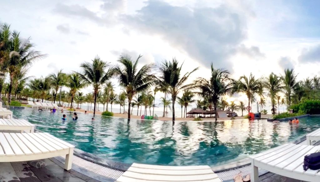 Theo lời giám đốc Hoàn thám thính từ trước thì khi phóng tầm mắt từ phòng mình về phía biển, sẽ có một bể bơi vô cực hướng ra biển, rộng bao la bát ngát khiến chúng tôi phấn khích vô cùng. Nhưng tìm mỏi mắt cũng ko ra bể bơi vô cực đâu, chỉ thấy một bể bơi cũng đẹp không kém nằm bên hàng dừa xanh xuyên qua ánh nắng chiều.