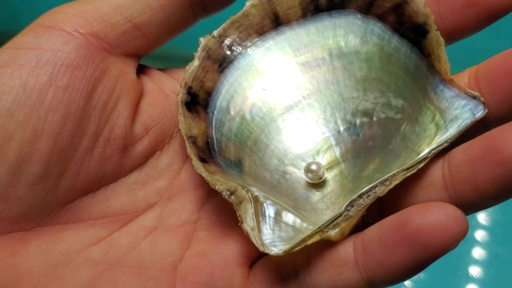 Chúng tôi chuyền tay nhau xem thành phẩm hạt ngọc trai sau hai năm hình thành, màu sắc của viên ngọc trai sẽ phụ thuộc vào màu sắc của vành môi bên trong con trai.